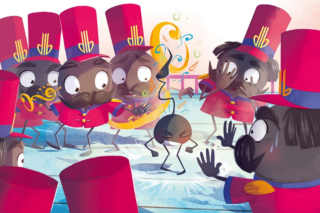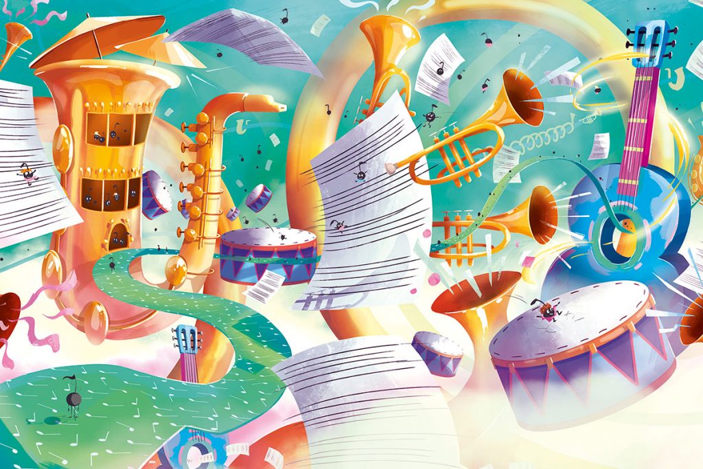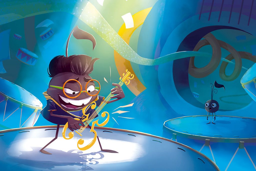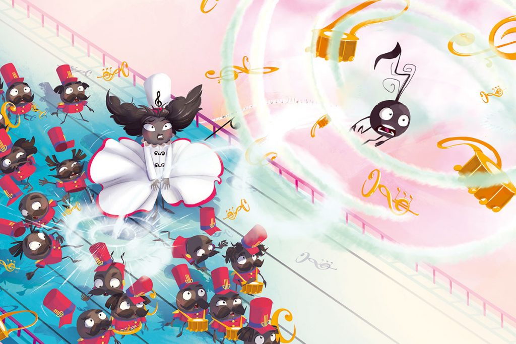 « Petit Son habitait une partition de solfège. Il était rond, rebondi et composé d’une suite de notes légères. Une nuit, alors que la famille Sol sifflotait, bourdonnait et ronronnait dans son sommeil, Petit Son entendit un bruit inhabituel, un son venu d’ailleurs…«